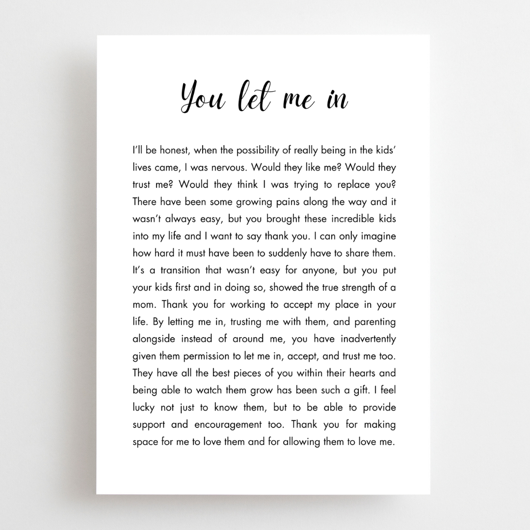 You were the newbie entering into their family...and it took a bit, but she let you in. She accepted your role in the kid's lives and supports the love you give them. Wish her a Happy Mother's Day and let her know how grateful you are for them all.