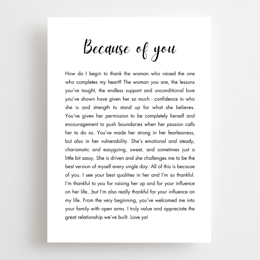 Your mother-in-law raised your wife and gave her all the qualities you love. She's accepted you into her family and loves you like her own. Send her your love today.