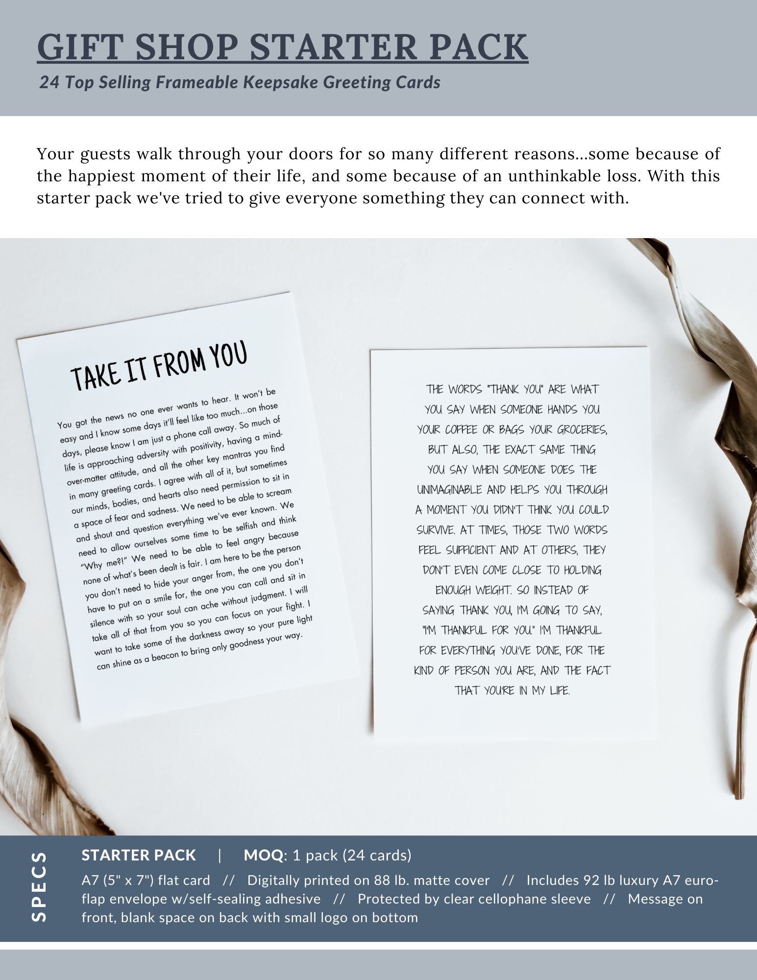 This starter pack has done exceptionally well when placed in gift shops because whether they've had a fantastic day, an incredibly hard day, or are just shopping for unique treasures - this pack includes a card for everyone.