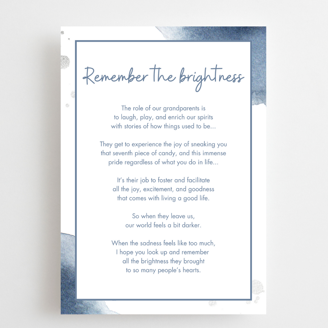 A grandparent's role is to laugh, play, and enrich our spirits with stories of how things used to be. Remind them how much brightness their grandparent brought.