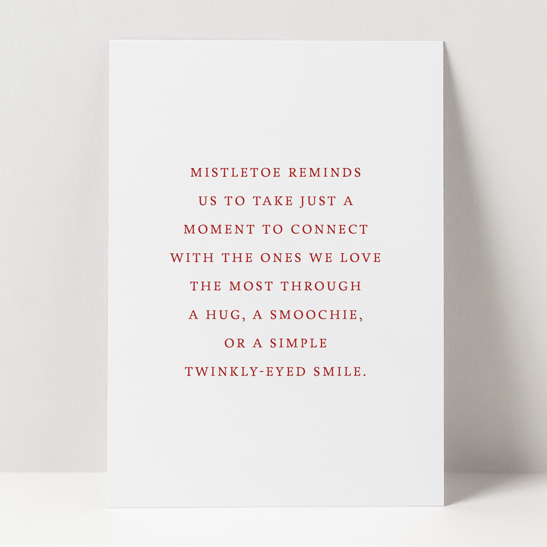 Mistletoe reminds us to take just a moment to connect with the ones we love the most through a hug, a smoochie, or a simple twinkly-eyed smile.